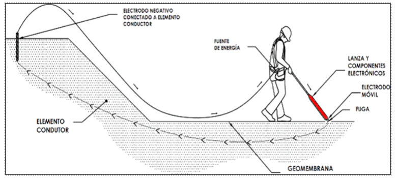 • El principio de este método es introducir un alto voltaje entre un electrodo de prueba de detección de fuga y el medio conductor que se encuentre bajo la geomembrana. Al encontrar una fuga, el circuito eléctrico se completa formando un arco eléctrico constante.
