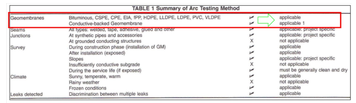 Esta técnica es apropiada para estudiar una geometría limpia, expuesta o ligeramente sucia, descubierta colocado directamente sobre una capa suficientemente conductora debajo la geomembrana eléctricamente aislante. La ASTM 7953 es una práctica estándar que describe el método de prueba de arco. El más bajo el material suficientemente conductor suele ser el suelo de la subrasante. Un electrodo se pone en contacto con el inferior suficientemente material conductivo o subrasante otro electrodo es introducido sobre la geomembrana como un conductor eléctrico sonda con una fuente de alimentación de muy alto voltaje. La sonda de prueba se barre sobre la parte superior de la superficie para inspeccionar la presencia de fugas. Donde una fuga ocurre, se crea un circuito cerrado y se forma un arco eléctrico producido. Además de un arco visual, el equipo tiene una alarma audible y visual. Diferentes tipos de pruebas pueden ser utilizadas con el equipo dependiendo del área a ser probada. Por ejemplo, pequeñas sondas se usan en áreas confinadas y grandes las sondas se pueden usar en áreas grandes y abiertas. Este método puede típicamente localizar fugas tan pequeñas como de 1 mm de diámetro y más pequeñas.