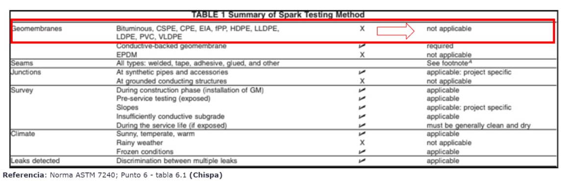La tecnología del equipo SENSOR DDS® MIT está bajo Norma ASTM  D7953, quien a dejado a la prueba de Arco Voltaico (Arc Testing) como la única tecnología sin uso de agua recomendada para detectar roturas y perforaciones en geomembranas NO conductivas.