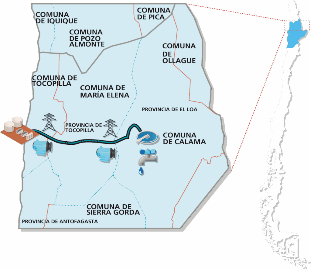 El Proyecto consiste en la instalación de una Planta Desalinizadora, junto con su sistema de transporte de agua, incluyendo un sistema de suministro de energía con dos líneas de transmisión de alta tensión (LAT), y las subestaciones correspondientes, así como un reservorio de agua de alta montaña y un sistema de distribución de agua; con el objetivo de producir y entregar agua desalada directamente a las minas de CODELCO Radomiro Tomic (DRT) y Chuquicamata (DCH), e indirectamente, por un sistema de recirculación de agua, a la mina Ministro Hales (DMH).