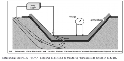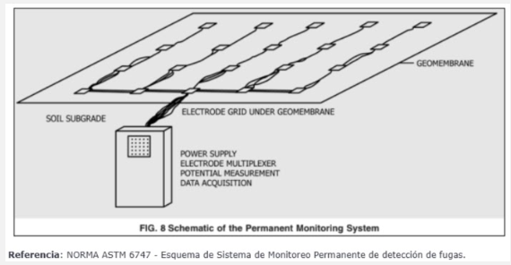 Este sistema de monitoreo permanente ha sido desarrollado para monitorear fugas durante la construcción, después de la construcción, a lo largo de la vida operacional y durante la vida post-operacional de una geomembrana bajo revestimientos interiores y revestimientos finales revestidos de vertederos. La figura muestra un diagrama de una instalación típica. Una fuente de alimentación eléctrica está conectada a electrodos sensores colocados en una rejilla regular o irregular en el material suficientemente conductor arriba o debajo de la geomembrana. Los electrodos colocados debajo de la geomembrana requieren instalación antes de instalar la geomembrana. Los electrodos de referencia pueden colocarse arriba o debajo de la geomembrana, o en la tierra fuera de la instalación de la geomembrana.