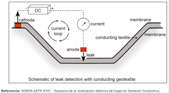 El uso de un geotextil conductivo adecuado instalado entre un suelo o material no conductor y la geomembrana permitirá realizar un levantamiento de ubicación de fugas eléctricas.